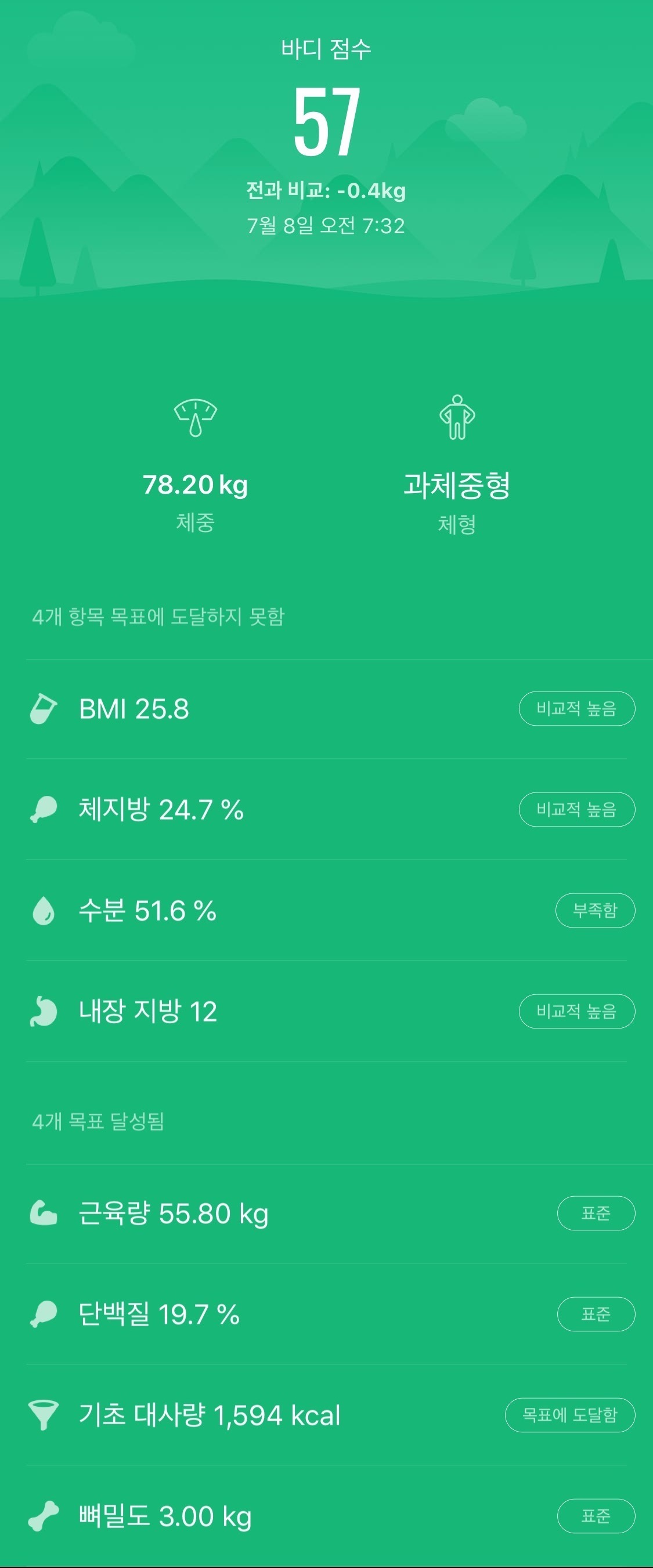 57 -> 57 오늘은 점수에 변화가 없다. 하지만 체중과 체지방이 같이 빠지는 성과가 있었다.